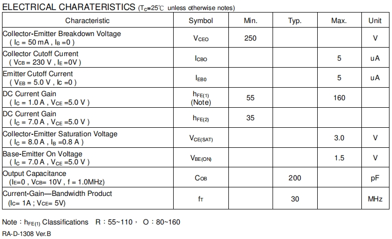 集電極 - 發(fā)射極飽和電壓(VCE(SAT)):在集電極電流為8.0A,基極電流為0.8A時,VCE(SAT)的最大值為3.0V。較低的飽和電壓意味著在晶體管導通時,能量損耗較小,從而提高了功率放大器的效率。