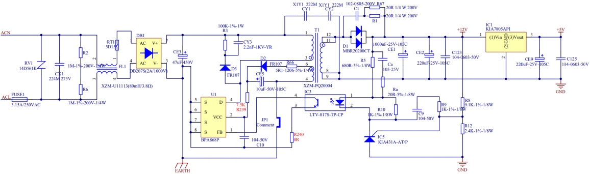 在主電路部分,BPA861AP芯片通過集成的高壓MOSFET實現開關功能,將輸入的交流電轉換為高頻脈沖信號,再經過變壓器進行隔離和降壓,最終通過整流濾波電路輸出穩定的12V直流電壓。光耦和TL431組成的反饋電路能夠實時監測輸出電壓的變化,并將反饋信號傳遞給BPA861AP芯片,從而實現對輸出電壓的精確調節。