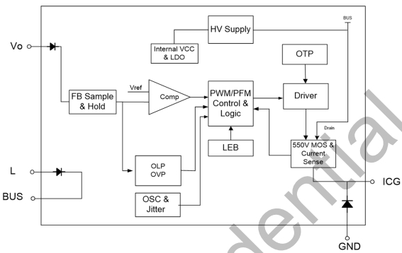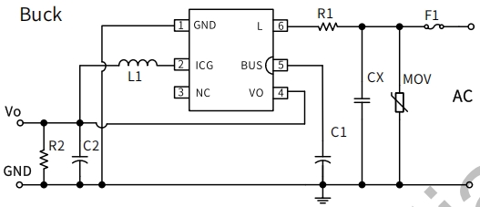 ICG(管腳 2):芯片地,同時(shí)也是內(nèi)置 MOSFET 的源極和內(nèi)置續(xù)流二極管的陰極。該管腳為芯片的內(nèi)部控制電路提供了接地參考點(diǎn),并確保 MOSFET 能夠正常導(dǎo)通和關(guān)斷。