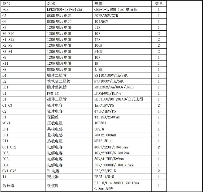 BOM(物料清單)是DEMO樣板的重要組成部分,它詳細(xì)列出了所有用于構(gòu)建電源的元件。LPKSF001的BOM清單包括: