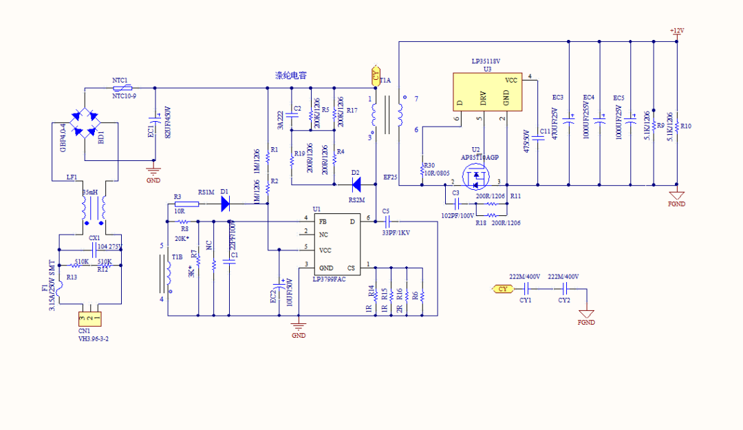 LP3799FAC的原理圖設計體現了其高度集成和優化的特點。電路圖中,我們可以看到主要的電源管理IC(U1),以及與之配合的外圍元件,包括輸入濾波器、變壓器、輸出整流和濾波電路等。電路設計中還包含了多重保護機制,如輸入過欠壓保護、輸出短路保護、過溫保護等,確保電源方案的穩定性和安全性。
