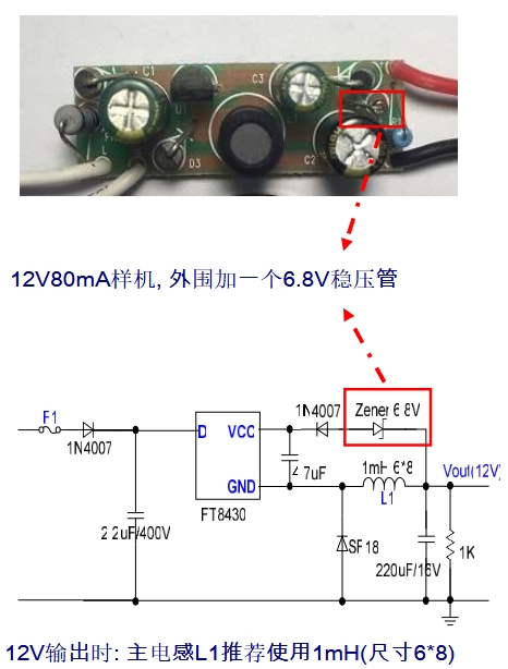 在該電路中,F(xiàn)T8430通過一個470uH的工字電感和一個1uF/400V的電容實現(xiàn)5V-120mA的輸出。該電路具有內(nèi)置抖頻功能,能夠輕松通過EMI測試,適用于需要高精度電壓和低待機功耗的小家電設(shè)備,如智能插座、智能照明設(shè)備等。