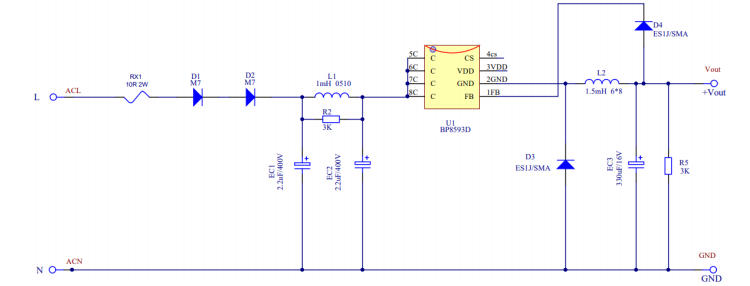 在智能家居、小家電、MCU待機(jī)供電等超小功率場景中,非隔離輔助電源因成本低、體積小、設(shè)計(jì)簡單而備受青睞。過去,OB2222E曾是這類100mA級方案的主流選擇,但受限于交期、價(jià)格及EMI裕量,工程師急需一顆直接替換、性能更優(yōu)的新品。BP8593D以 SOP7封裝、內(nèi)置700V MOS、PSR架構(gòu)、<100mW待機(jī)功耗為核心賣點(diǎn),官方參考設(shè)計(jì)5V/100mA已完整驗(yàn)證,BOM、PCB、測試數(shù)據(jù)一步到位,可實(shí)現(xiàn)零調(diào)試替代OB2222E。本文帶你一圖看懂這顆“小鋼炮”。