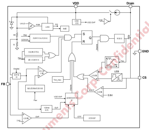 所有型號均內置 500V 高壓 MOSFET高壓啟動電路多模式 PWM 控制器,支持 Buck 和 Buck-Boost 拓撲,默認 12V 輸出(FB 腳懸空),待機功耗 <50mW